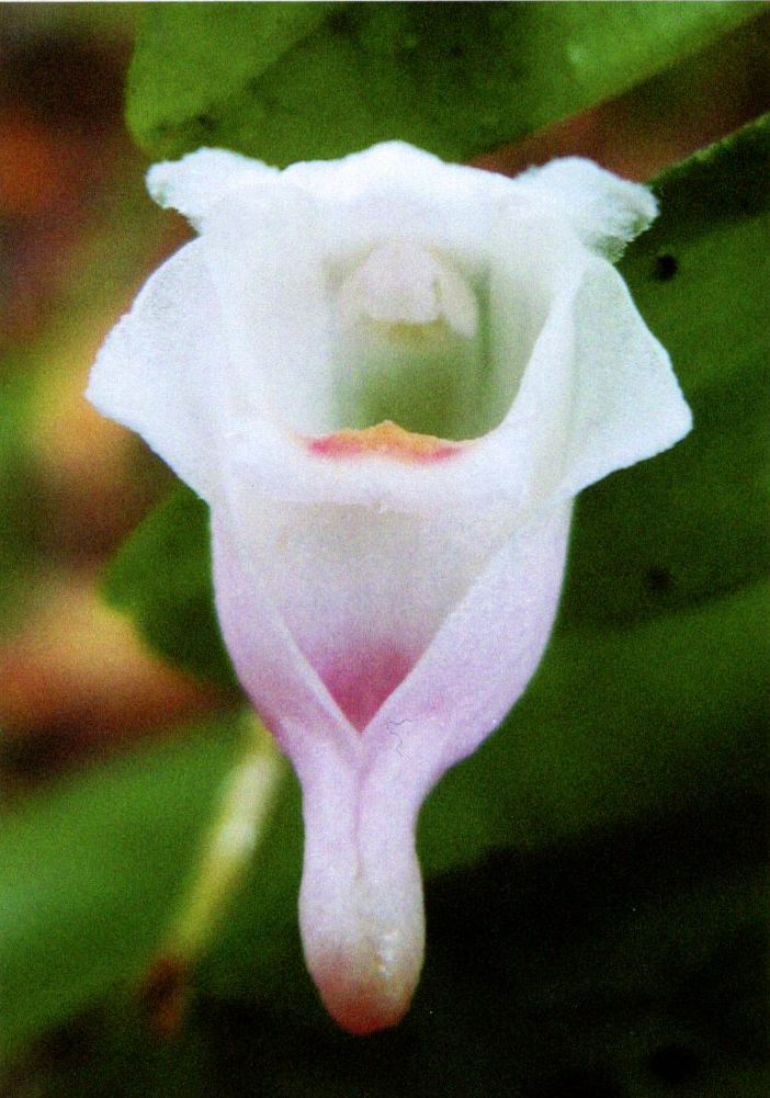Found in Sabah Borneo as a small to medium sized epiphyte with slender, branching stems carrying terete, not sulcate leaves that blooms in the late fall and early winter on a short, successively single, several flowered inflorescence with oblong-elliptic, obtuse, hyaline floral bracts and carrying ephemeral flowers with transluscent white sepals, the tips of the lateral sepals suffused pink, the petals are white, suffused with pinkl basally and a white lip with 2 purple spots.