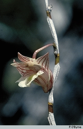 Found in New Guinea and Queensland Australia in lowland and beach forests at elevations of sealevel to 15 meters as a medium to large sized, hot growing epiphyte with crowded, erect, slender, 4 to 6 angled, slightly compressed, basally leafy, apically bare stems carrying coriaceous, bilaterally flattened, obliquely linear, acute leaves that blooms in the spring on a lateral, arising on the bare, apical stem, successively single flowered, fasciculate inflorescence with ovate, minute, apiculate floral bracts that are much shorter than the ovary and pedicel.