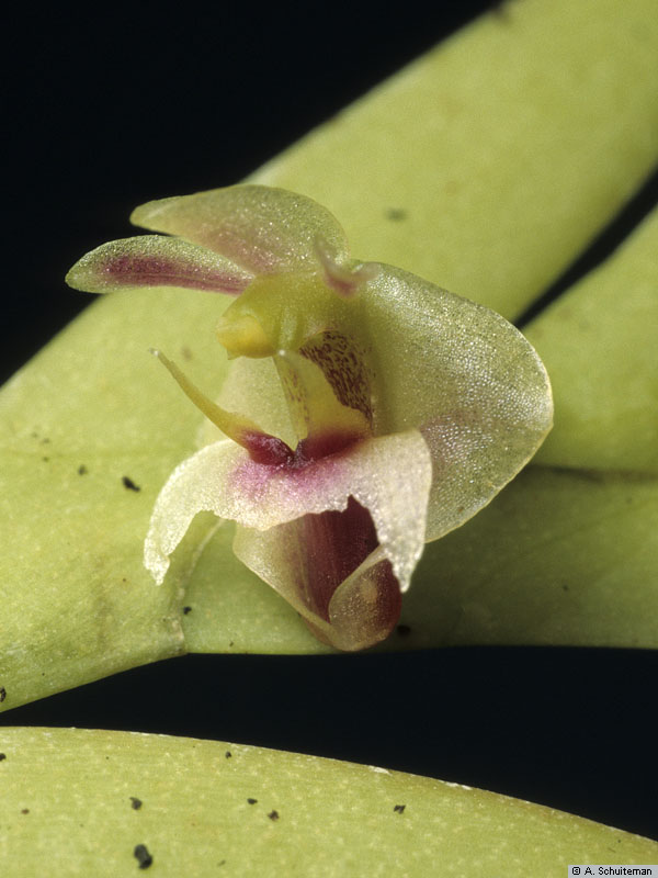 Found in Borneo, Java, Malaysia and Sumatra large trees next to rivers and in freshwater swamps at elevations of sealevel to 1000 meters as a medium sized, hot to warm, pendant growing epiphyte with a clumping, flaccid, leafy throughout, often branching, pendulous stem with small, acute, imbricate, conduplicate leaves and blooms in the winter and summer on a very short, axillary, successively single flowered inflorescence, carrying non-resupinate flowers