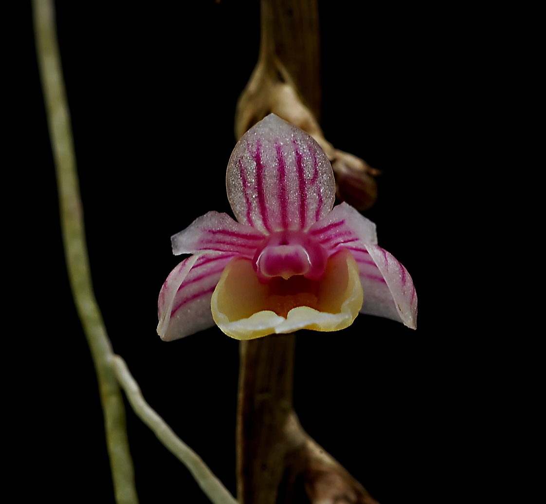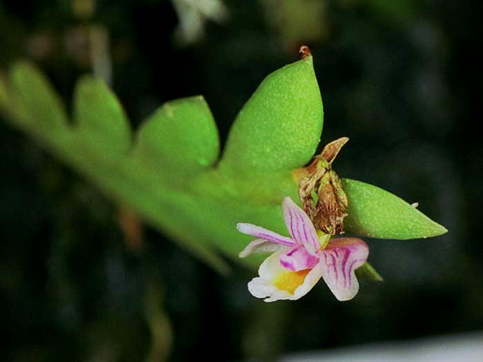 Found in Sumatra, West Java, the Moluccas and Borneo in lowland forests as a medium sized, hot to cool growing epiphyte at elevations of sea level to 1200 meters with pendulous, flattened, branching stems that are leafy all along the stem and carry many, imbricating, triangular, stiff, fleshy, pointed, dull green or purple green leaves that are smallest at the apex and largest towards the base that blooms in the spring and fall on a very short, several sequentially flowered inflorescence with only 1 or 2 flowers open at a time and arise from the nodes on or near the apex of mostly leafless pseudobulbs. In winter the plants should be left to dry out in between waterings and fertilizer should be withheld until the onset of new growth in the spring.
