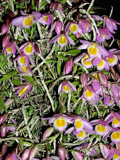 This is a miniature to small sized, cool growing epiphyte, lithophyte or terrestrial that comes from Laos, Vietnam, Guangdong, Guangxi, Guizhou, Hainan and Yunnan provinces of China and Hong Kong and is found in humid, mossy, mixed and coniferous forests at elevations of 1000 to 1500 meters with tufted, pendant, subterete, striated, several noded, white sheathed stems carrying alternate, fleshy, oblong, acute leaves and has a dry winter and a wet spring and summer. The longlasting, fragrant sweetly floral scented flowers are found from February through June on short to 3" [7.5 cm], single flowered inflorescence that arise from the nodes of leafless canes.
