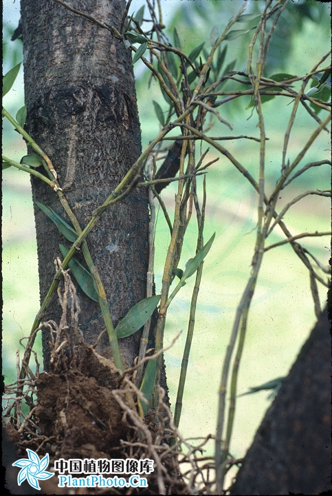 Found in Chongqing, north Guangdong, southeastern Guangxi, western Guizhou, western Hubei, Hunan and southeastern Yunnan provinces of China in montane valleys and on forest margins on rocks at elevations of 1000 to 1500 meters as a large sized, cool growing lithophyte with cylindric, slightly rigid, many noded, several longitudinal ridged stems carrying many, in two rows, oblong, leathery, acute apically, contracted into the clasping sheath below leaves that blooms in the late fall and early winter on a short to .8" [2 cm] long, lateral to axillary, 1 flowered inflorescence arising from the upper nodes of the stem and carrying waxy, slightly fleshy flowers