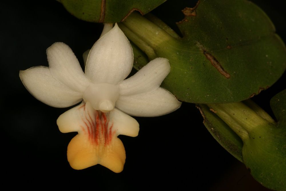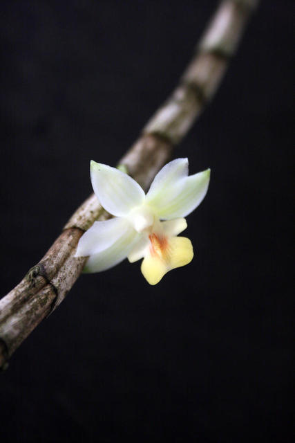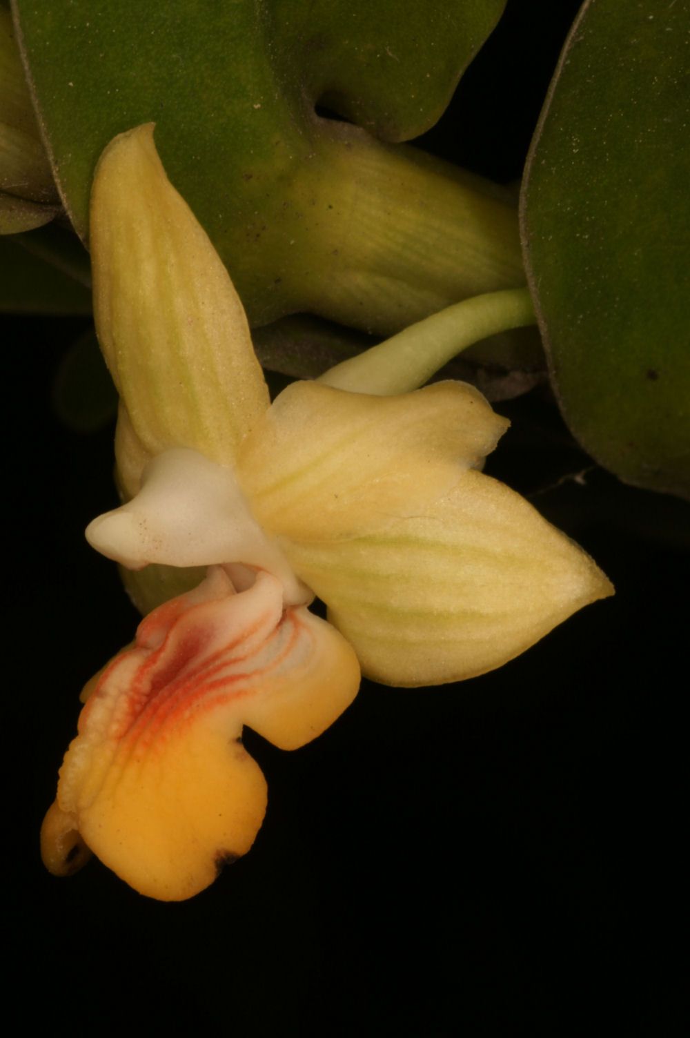 Found in Sabah and Brunei Borneo in heath and hill forests at elevations of 400 to 900 meters as a medium to large sized, hot to warm growing epiphyte with clustered, erect, becoming pendulous, leafy stems carrying many, distichous, thin textured, coriaceous, dark green, narrowly oblong to oblong-elliptic, minutely unequally subacutely bilobed leaves that blooms in the winter on a single flowered inflorescence arising mostly on older leafless stems with usually 2 to 3 per stem.