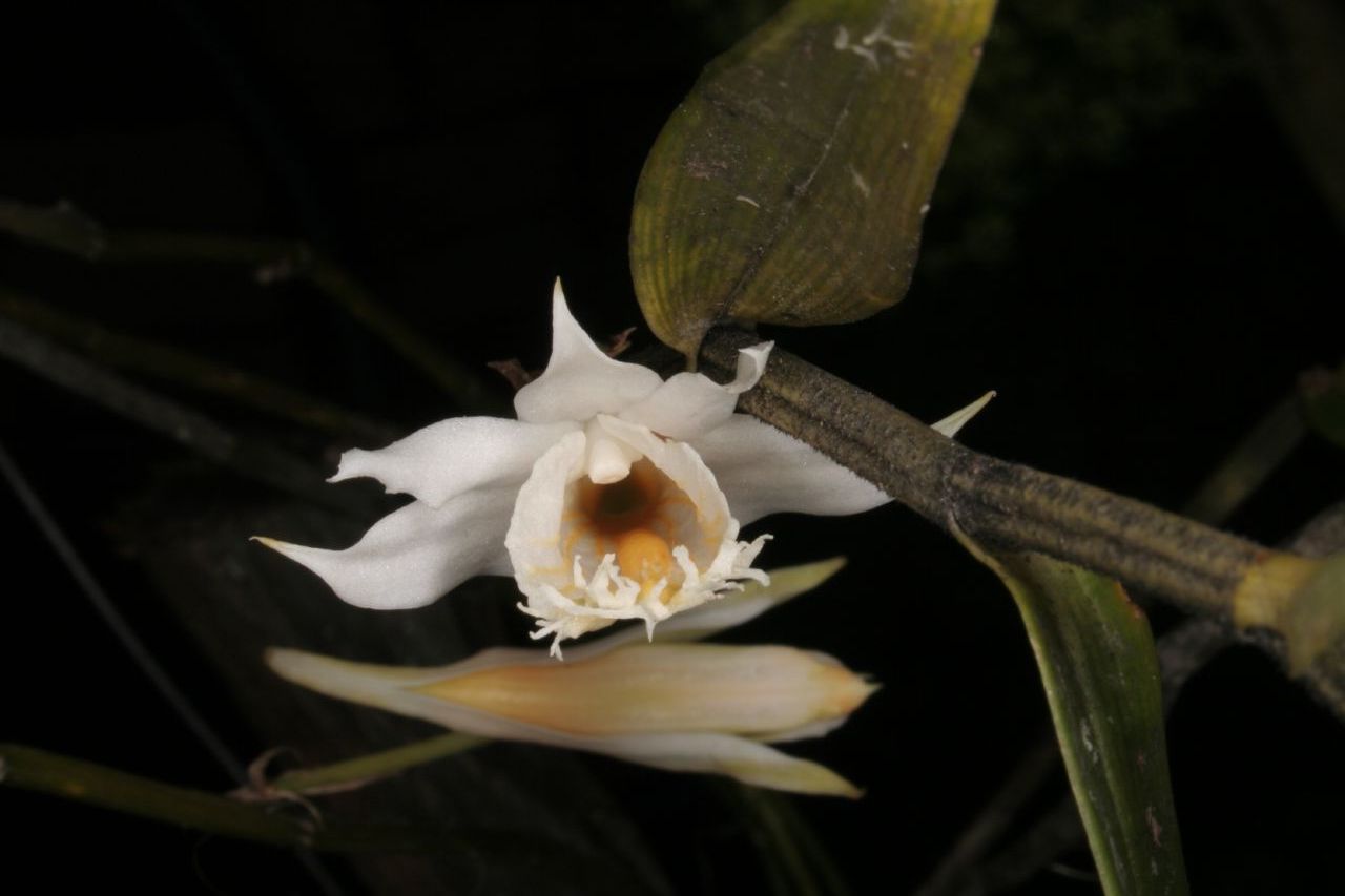 Found in the eastern Himalayas, Assam, Bangladesh, Nepal, Bhutan, Sikkim, Myanmar, southern China and Vietnam in humid, mossy, mixed and coniferous forests on mossy branches of old, dwarf, gnarled trees and primary montane forests at elevations of 1200 to 3000 meters on mossy trees, or terrestrially on sandy banks in pine forests or in mist forests on ridges as a small sized, cool to cold growing epiphyte or terrestro-lithophyte where there is high light and the plant can dry quickly. This species has tufted, minutely sulcate, somewhat fractiflex, several noded, covered in black hairs stems and carrying 5 to 11, deciduous, linear-lanceolate, obliquely acute leaves that blooms in the fall on very short, axillary racemes that arise from near the top of leafed canes with 1 to 3, fragrant, waxy, longlasting flowers and needs a short dry winter rest of 1 or 3 months at most.