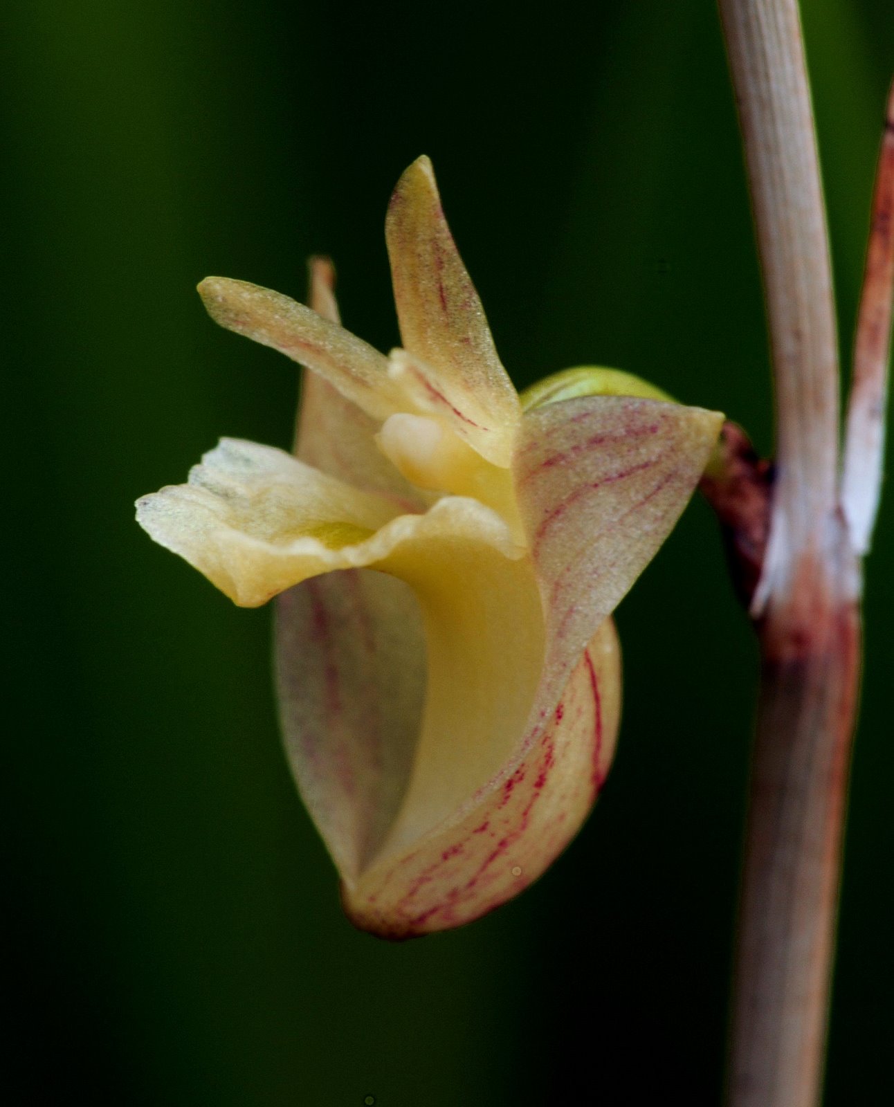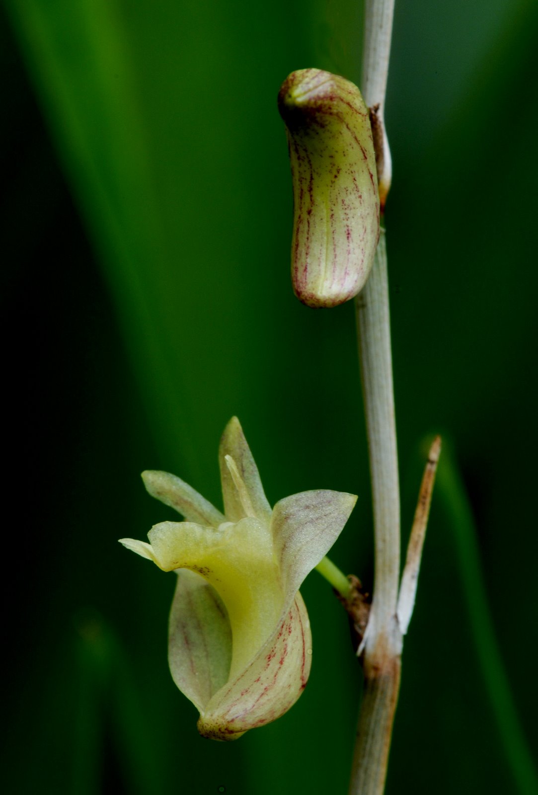 Found in New Guinea in foothills at elevations of 150 to 200 meters as a large sized, hot growing epiphyte with basally swollen, 4 to 5 sided, becoming branching, slightly flattened, rigid and wiry, shiny becoming dark with age stems carrying many, linear-lanceolate, folded, distichous leaves that blooms in the spring on a short, 1 to 2 flowered, inflorescence with the short lived flowers held towards the apex of the stem.