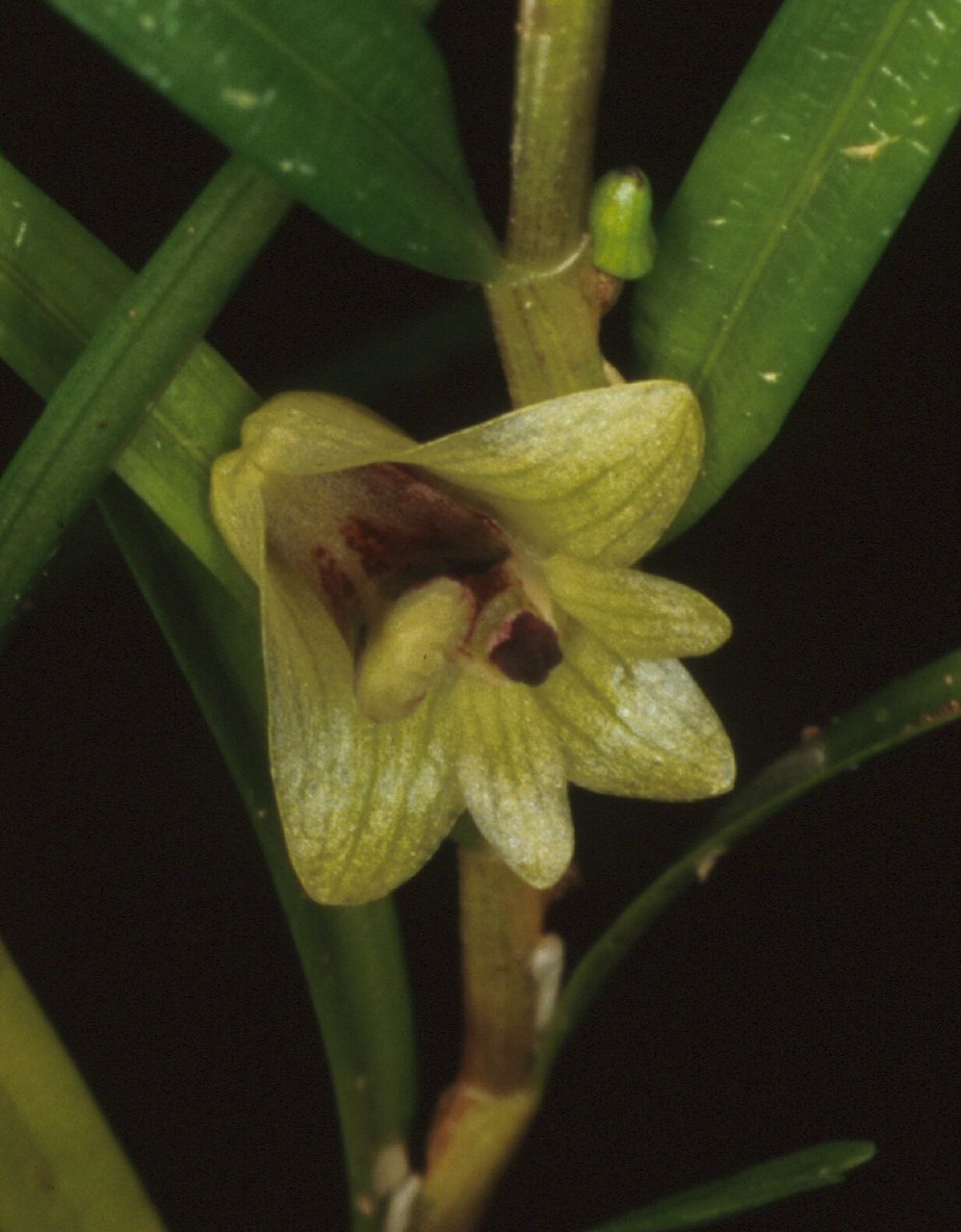 Found in New Guinea and Queensland Australia on high branches of rainforest trees at elevations of sealevel to 1500 meters as a miniature to medium sized, hot to cool growing epiphyte with thin, wiry stems carrying 10 to 20, all along the stem, persistent, thin, linear, grasslike, light olive green leaves that are held on the upper half of the stem and blooms in the summer and fall on a short, single flowered inflorescence with short lived flowers