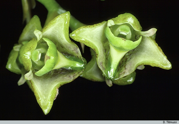 Found in New Guinea and the Bismark archipelago in mossy, montane rainforests at elevations of 1800 to 3100 meters as a miniature to small sized, cool to cold growing erect to pendant growing epiphyte with close set, narrowly clavate to fusiform, slender and terete below, several noded pseudobulbs carrying 2 to 4, apical, coriaceous, narrowly elliptic-lanceolate, shortly petiolate, acute leaves that blooms at most any time of the year on 1 to 4, subterminal, erect to arcuate, axillary, 3.4 to 4" long [8.5 to 10 cm] long, 5 to 7 flowered, terete inflorescence with 3 amplexicaul sheaths and falcate, lanceolate, acuminate floral bracts.