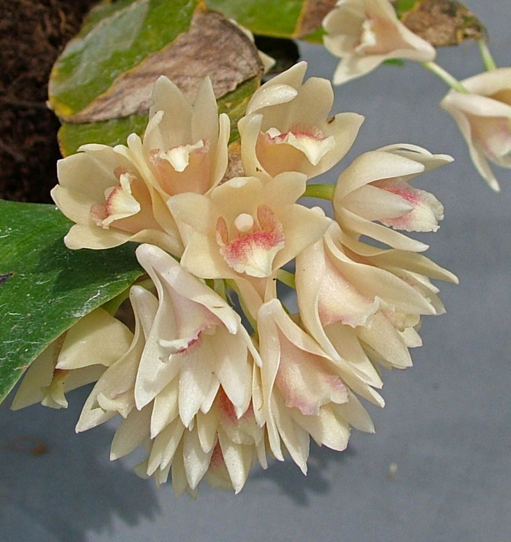Found in Leyte Philippines hanging over water at elevations around 600 meters as a small sized, warm growing epiphyte with semi-pendulous clavate, laterally flattened pseudobulbs carrying 3 to 6, on the top 1/3 of the stem, lanceolate, green leaves that blooms on a pendulous, to 4 flowered inflorescence.