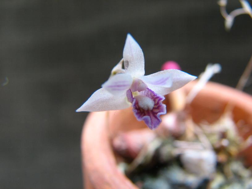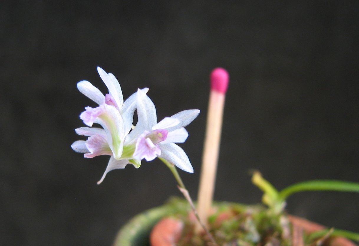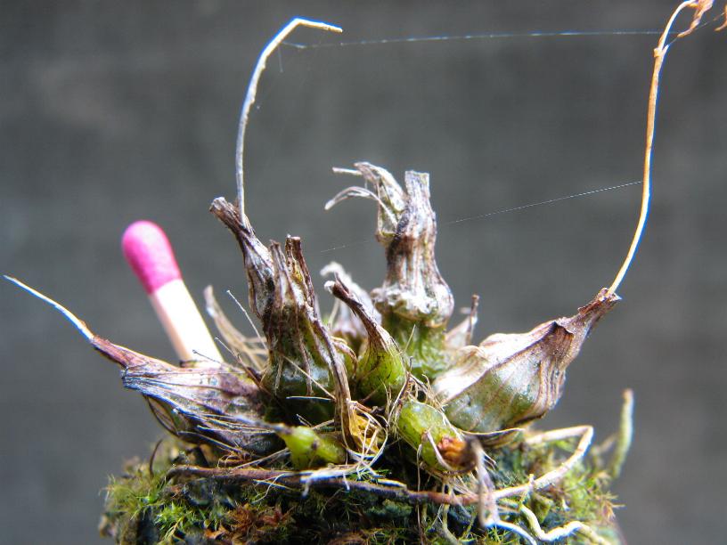 Found in the eastern Himalayas, Sikkim, Nepal, Bhutan, Thailand and Guanxi and Xizang provinces of China in mountain valleys on rocks at elevations of 1500 to 2300 meters as a mini-miniature sized, cool to cold growing lithophyte with clustered, tapering to the apex pseudobulbs carrying 2 to 4, apical, thinly coriaceous, linear-lanceolate, acuminate, apically bilobed leaves that blooms in the summer on a terminal or arising from nodes near the apex, erect, slender, 2 to 6" [5 to 15 cm] long, 3 to 8 flowered inflorescence.