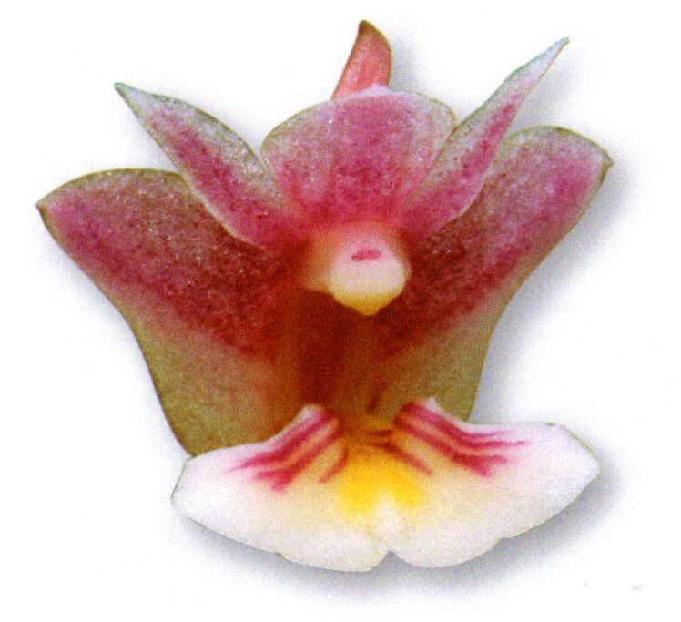 Found in Sarawak Borneo in upper hill kerangas forests to lower montane mossy elfin forests at elevations of 800 to 1650 meters as a mini-miniature sized, warm to cool growing epiphyte with laterally compressed, leafy ste4ms carrying obliquely ovate to oblong-ovate, obtuse to subacute, laterally compressed, fleshy, rigid, equitant, shethed leaves that blooms on subterminal, from a group of fasciculate, chaffy bracts, successively single, few flowered inflorescence.