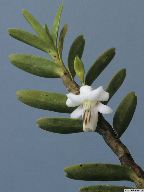 Found in Borneo in lower montane podosol forests always above the canopy in full sun at elevations around 400 to 1400 meters as a medium sized, hot to cool growing epiphyte with 1.6 to 2.4" between each, elongate, pale, yellow-green, 4 angled canes carrying many, linear, dark green, leathery, apically bilobed and slightly twisted basally leaves that blooms at most any time of the year on a few, single flowered inflorescence that arise from the nodes all along the stem.