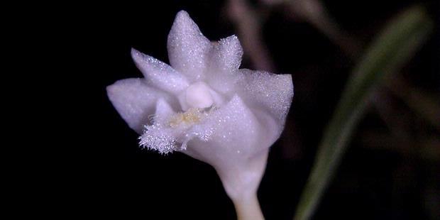 Found in west Kalimantan Borneo alongside rivers in lowland forests as a small sized, hot to warm growing epiphyte with clustered, simple to branching, basal 2 to 3 internodes swollen, forming a 4 angled, fusiform pseudobulb, terete, green in youth, upper internodes becoming brownish green stems carrying deciduous, thin, narrowly elliptic to narrowly lanceolate, midnerve prominent on abaxial side, slightly undulate margins, tapering to a sub-acute, unequally bilobed toothed apex, green sometimes infused with maroon leaves with the basal sheath tightly encircling the stem, narrowly linear, acute, bristle-like mucro opposite the blade, persistent, green soon becoming dirty white sheaths that blooms at most any time of the year on a sessile, arising from the nodes in the upper half of the stem, single flowered inflorescence and carrying a flower that lasts 2 to 3 days.