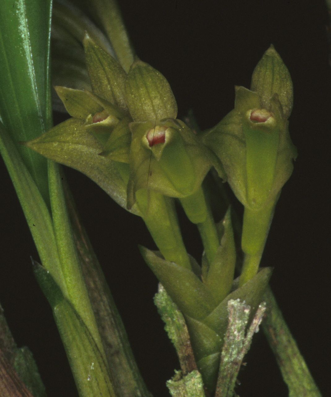 Found in New Guinea, the Moluccas and the Philippines in misty montane forests at elevations of 1400 to 2800 meters as a miniature sized, cool to cold growing epiphyte with variable sized pseudobulbs carrying 1 to 3, rarely 4 persistent, pale green, red striped leaves that blooms at most any time of the year on a cluster of .6" [1.6 cm] long, 2 to 5 inflorescence arising on both leafless and leafy canes.