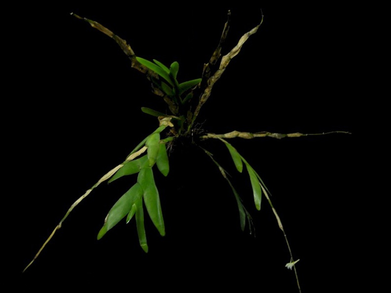 Found in the Philippines at elevations around 500 meters as a large sized, hot to warm growing epiphyte with pendulous, flattened, non branching stems carrying laterally flattened, lanceolate, plain green or suffused with purple leaves that blooms on a short, single flowered inflorescence arising from the leafless tips of the stem and carrying non-fragrant flowers.