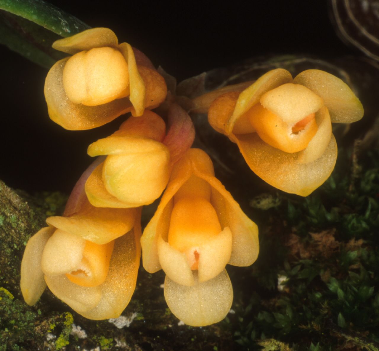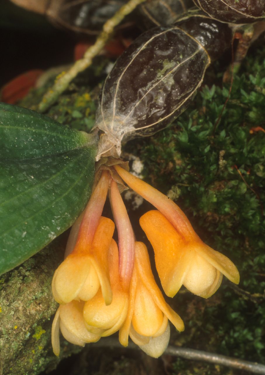 Found in Papua and New Guinea as a small sized, cool to cold growing epiphyte found on Nothofagus trees at elevations of 1800 to 2800 meters with spherical to oblong-ovoid, rugose, brown to reddish brown stems carrying a single, apical, elliptic, thick, leathery, tesselated on top, purple beneath leaf that blooms on a very short, few to many flowered inflorescence arising at the apex of leafed and leafless canes with 3 to 20, tubelike flowers.