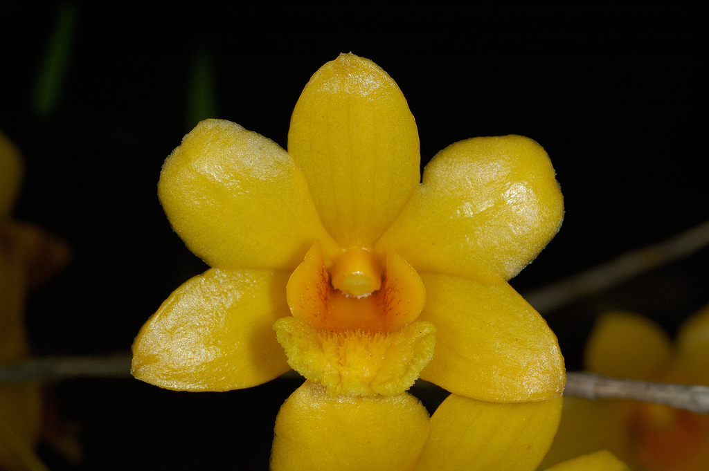 Found in Yunnan Province in the south of China at elevations of 200 to 1500 [1600 to 2150] meters as a medium to large sized, hot to cool growing epiphytic orchid with slender, occasionally branching stems carrying linear, 3/4" [2 cm] long or less, unequally bidentate apically leaves that blooms on a short, axillary, 1 to 2 flowered, fragrant inflorescence that arises from the apical leaf axils of last years mature canes and occuringin the spring with strongly scented [honey] flowers.