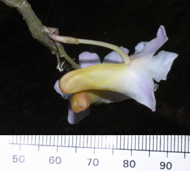 Found in Borneo in hill forests at elevations around 300 to 600 meters as a giant sized, hot to warm growing epiphyte with clustered, erect becoming pendent with age stems sometime producing leilis and carrying ovate to elliptical, acute leaves with minute, very short black haired [not hirsute] sheaths that blooms in the spring on many all along the stem, .48 to .54" [1.2 to 1.3 cm] long, , 1 to 4 flowered inflorescence arising on leafless stems with triangular, acute, adpressed, transluscent, apex green floral bracts and carrying slightly sweetly scented flowers.