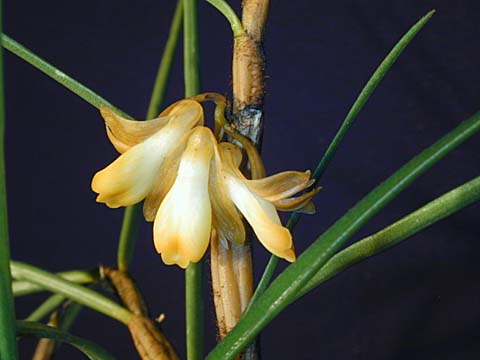 Found in Myanmar, Thailand, Malaysia, Laos and Vietnam in primary montane forests as a small to large sized, warm to cool growing epiphyte or lithophyte found low on trees or mossy rocks at elevations of 610 to 1220 meters with slender, somewhat pendant, basally and apically narrowed, clustered stems carrying many, grass-like, linear leaves with black, hairy leaf sheaths that blooms on a very short, lateral, one to few flowered inflorescence arising from the center of the leaf cluster with 1 to 2, color variable flowers.