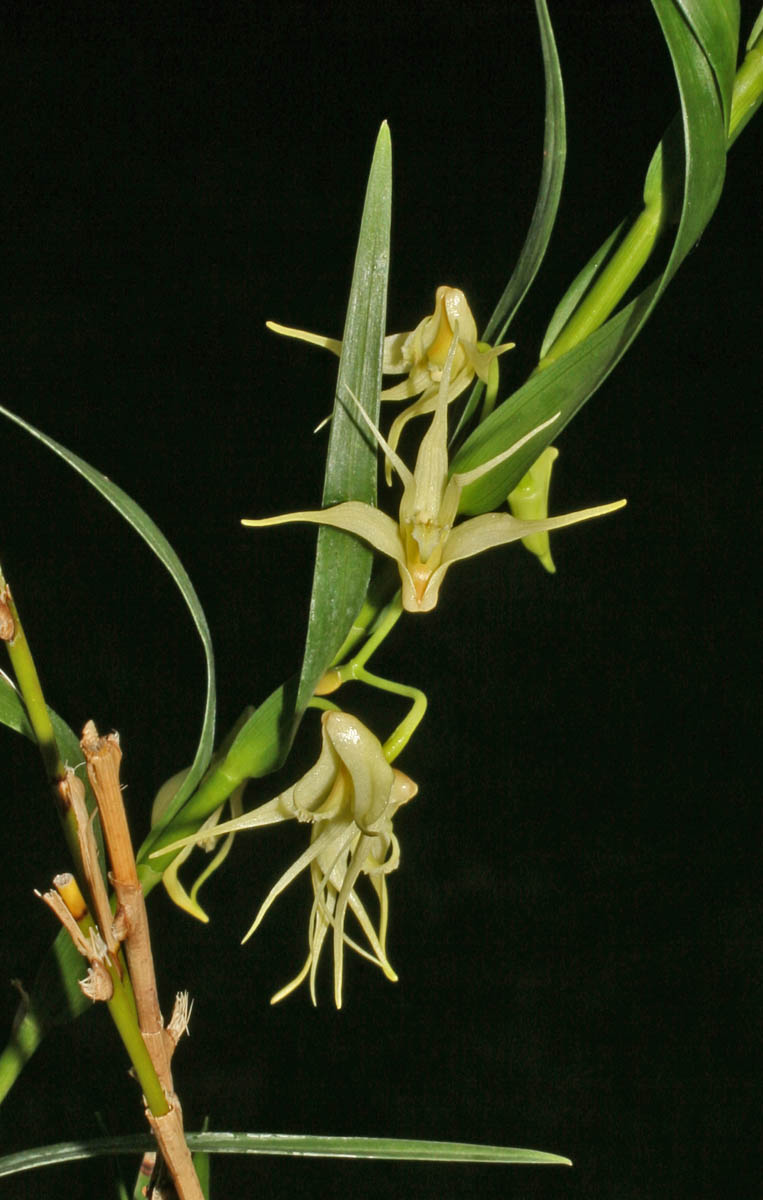 Found in the Caroline Islands in scrub forests at elevations of sealevel to 300 meters as a medium sized, hot growing epiphyte with pendent canes carrying ligulate-lanceolate, obtuse apically, contracted below into the base leaf that blooms in the later winter and early spring on a peduncle to 1" [2.5 cm] long, 2.2" [5.5 cm] long overall, 2 to 5 flowered inflorescence carrying thick, fleshy flowers.