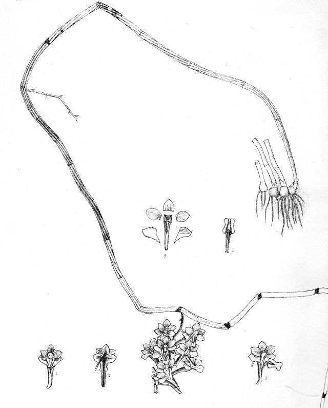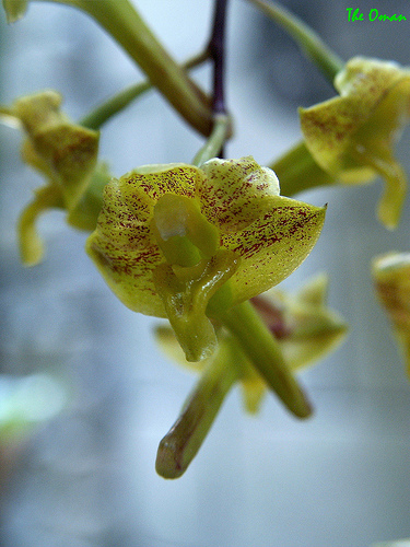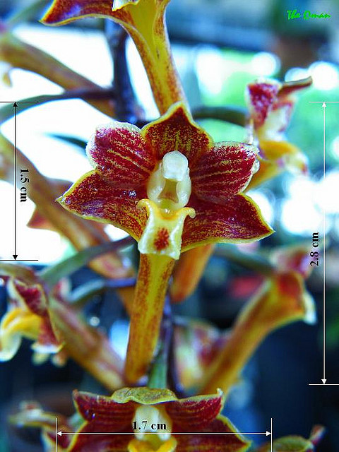 Found in Myanmar, penninsular Thailand, Malaysia and Sabah Borneo in low montane forests high in trees at elevations around 250 to 600 meters as a small to medium sized, hot to warm growing epiphyte with weak, flexuous, grooved, cylindrical, basally narrowing cane-like stems carrying 10, thin, lanceolate-elliptic, acute, deciduous, basally clasping leaves that blooms in the spring on a 1 to 2" [2.5 to 5 cm] long, 6 to 12 flowered inflorescence arising from near the middle to near the top of leafless canes and carries flowers that can be spotted or striped or variations in between.