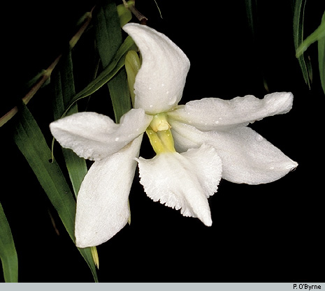 Found as a large sized, warm growing epiphyte or lithophyte in the Philippines on trunks and branches of trees and on rocks at elevations of 900 to 1000 meters with a simple, never branching, usually erect, smooth, greenish yellow stem carrying many, linear-lanceolate, acute leaves around the lower portion of the stem that blooms in the summer and winter on a terminal, short, single flowered inflorescence with showy flowers arising close on a leafless cane.