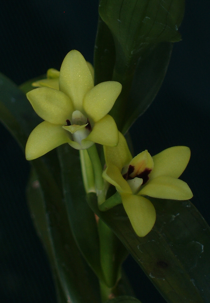 Found in western New Guinea at lower elevations as a medium sized, hot growing epiphyte occuring along rivers with rigid, elliptical in crossection stems carrying many, narrowly lanceolate, apically blunt, 2 toothed leaves that blooms in cultivation in the spring and the fall in situ on short, few flowered inflorescence that arises laterally from flat sheaths with 2 pale yellow flowers.