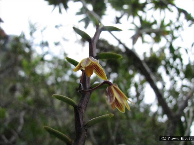 Found in New Caledonia in trees at elevations around 900 meters as a miniature to small sized, warm growing epiphyte with densely clustered, 4 angled, zigzag above stems carrying many, lanceolate, very unequally bilobed apically leaves that blooms at most any time of the year on several, short, 1 to 3 flowered inflorescence