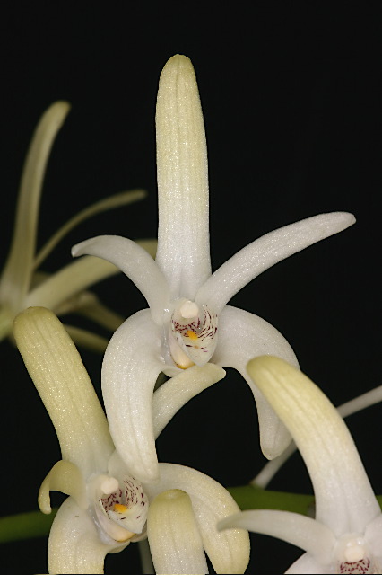 Found in Queensland Australia as well as New Guinea on the hot and dry western faces of the dividing range at 200 to 600 meters as a small sized, hot growing lithophyte in full sun where it is very hot and dry with conical, thick, erect, purplish stems carrying 2, glossy, purplish leaves and it blooms in late winter and spring on a medium length to 12" [to 30 cm], axillary, purple, racemose, inflorescence that arises from the upper nodes of leafed canes with many, fleshy, long-lasting flowers crowded at the apex of the scape. Greatly reduce water and eliminate fertilizer for 3 months in the witer until new growth arises in the spring.
