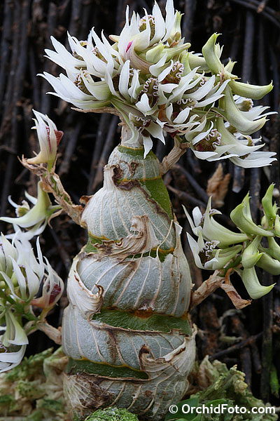 Found in the eastern Himalayas, India, Nepal, Sikkim, Myanmar and Thailand as a mini-miniature sized, hot growing lithophyte or epiphyte found on secondary shrub vegatation near streams in hot and humid areas at elevations around 300 to 400 meters with stout, leathery, fleshy, tufted, ovoid to globose to oblong-conical pseudobulbs carrying 2 to 4, sessile, broadly elliptic to linear-oblong, leathery, deciduous, acute to subacute apically leaves that blooms in the late fall after a months dry spell on 1 to 3, short to 3" [to 7.5 cm] long, axillary, simultaneously one to several [to 12 and more in cultivation] flowered, racemose inflorescence that arise from the nodes at or near the apex of the newly leafless cane with fragrant flowers.