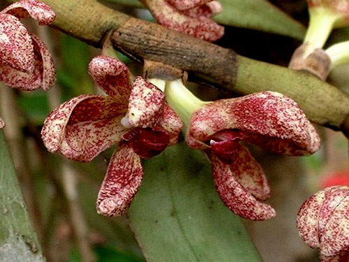 Found in the New Guinea on trees in montane forests at elevations around 1000 meters as a giant sized, warm to cool growing epiphyte with an elongate, flexuous, glabrous stem carrying many dense, narrowly lanceoalte-ligulate, obtuse, and unequally bilobed apically leaves that blooms innthe winter on a subsessile, 2 flowered inflorescence carrying fleshy flowers.