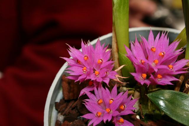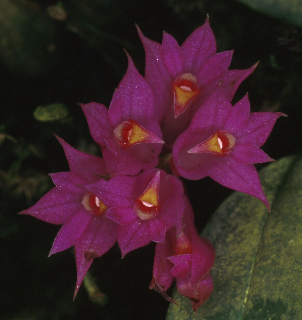 Found in New Guinea as a miniature sized, warm to cold growing, epiphytic orchid at elevations of 800 to 2400 meters on mossy horizontal branches in deep shade that has erect to suberect stems enveloped by fibers of persistent leaf sheaths carrying a single, oblong-elliptic leaf with a distinct stem and is semi-deciduous with the flowers occuring in the spring and summer on a short, few to many [4 to 20] flowered inflorescence arising from the nodes near the apex of leafless pseudobulbs.