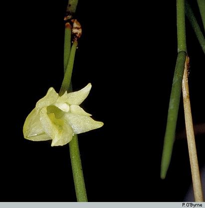 Found in the Philippines at low elevations as a miniature to medium sized, hot growing epiphyte with slender, spindle shaped, basally swollen stems carrying many, needle-like, persistent leaves that blooms in the winter and spring on a single flowered inflorescence arising from the leafless apex of the stem and carrying flowers that are fragrant in the morning