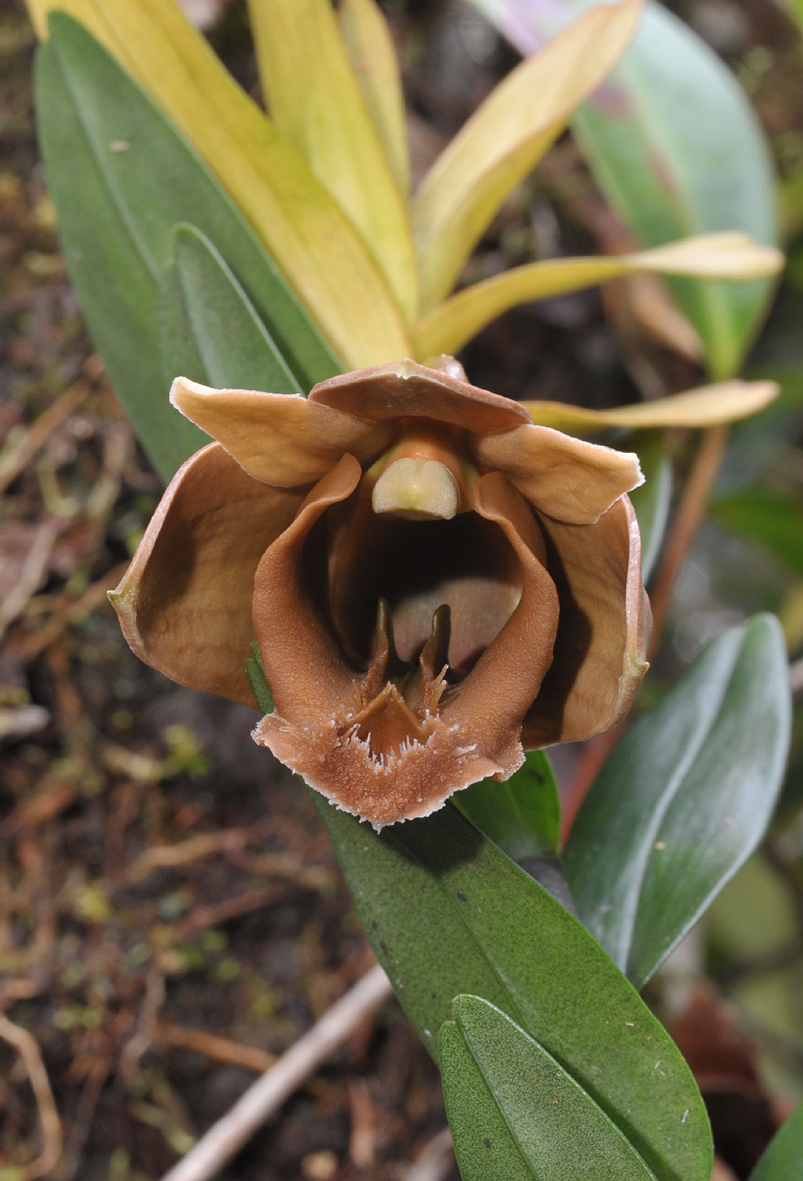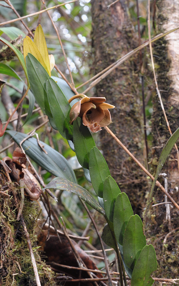 Found in Java, Sumatra and Borneo in lower montane mossy forests at elevations of 1400 to 2400 meters as a medium sized, cool to cold growing epiphyte or terrestrial with cane-like, flexuous, leafy stems carrying many, distichous, narrowly elliptic-lanceolate, unequally obliquely roundly bifid apically, greyish green, articulated below to a tublular, clasping, brown to black, scurfy haired in youth sheath that blooms in the summer on an axilary, single flowered inflorescence with elliptic, obtuse floral bracts and carrying very fleshy flowers.