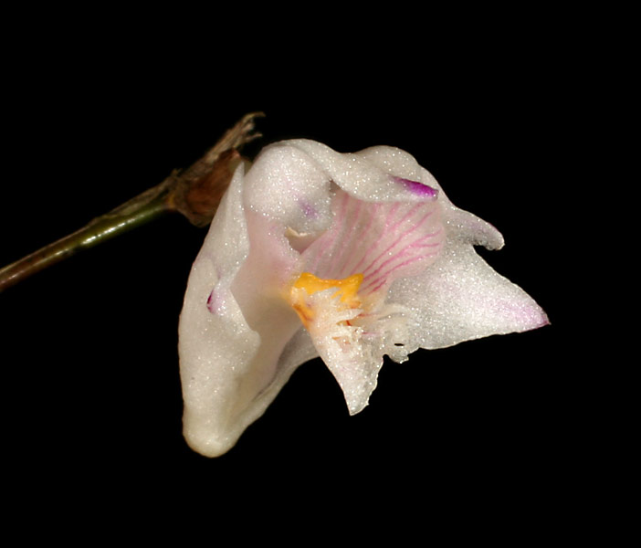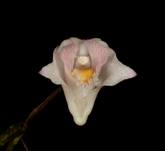 Found in Thailand, penninsular Malaysia, Java, Sumatra, Borneo and the Philippines at elevations around 700 meters as a medium sized, hot to warm growing epiphyte with erect stems, the upper flower bearing part usually leafless, the middle stem is leaf-bearing and the basal internode is swollen, ovoid, 4 angled pseudobulb carrying purple flushed, elliptic, rounded apically, gradually narrowing below into the basally clasping leaves that blooms in the fall through early spring on very short, single flowered inflorescnce arising along the apical, leafless portion of the stem and carrying very short lived, fragile flowers.