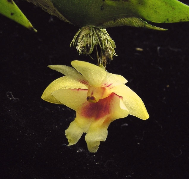 Found in Kalimantan Borneo in hill forests and mixed lowland dipterocarp forests at elevations of 100 to 300 meters as a miniature to medium sized, hot growing epiphyte with spreading, bilaterally strongly laterally compressed, hardly sinuous, leafy throughout pseudobulbs carrying bilaterally strongly compressed, obliquely ovate, triangular, acute to acuminate, attenuate, at an acute angle tothe stem, coriaceous leaves that blooms on a lateral ojn the distal portion of the stem, arising through dry brown bracts from which 2 to 3 green, acute bracts protrude, successively single flowered inflorescence carrying downward facing flowers.