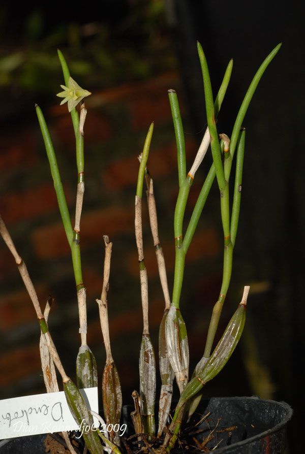 Found in Sulawesi close to the sea on trees in mangrove swamps as a mini-miniature sized, hot growing epiphyte with yellowish to reddish, swollen towards the base, apically somewhat flattened, erect pseudobulbs carrying 3, towards the apex, almost circular in cross-section, widely spaced, terete, fleshy leaves held almost parrellel to the stem that blooms on a short, single flowered inflorecence arising towards the apex of the stem and carrying fragrant flowers.