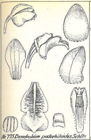 Dendrobium podochiloides Schltr. 1912 SECTION Grastidium [Bl] J J Sm 1905 Type Drawing by © Schlechter and The Swiss Orchid Foundation at the Jany Renz Herbaria Website