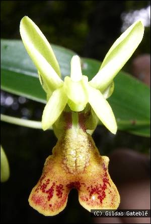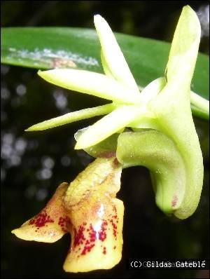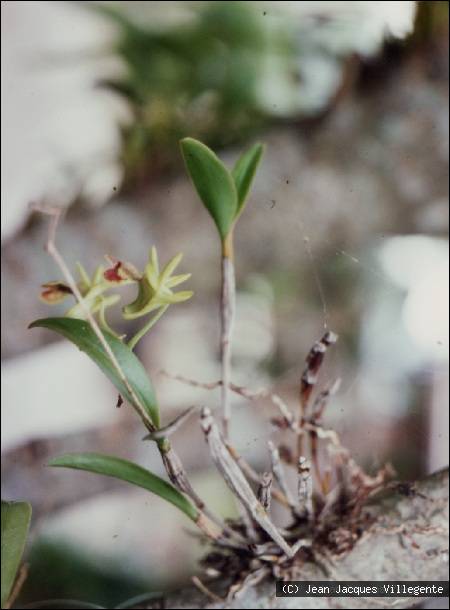 Found in New Caledonia in humid scrub forests at elevations of 400 to 900 meters as a mini-miniature to miniature sized, hot to warm growing epiphyte with basally swollen, nearly cylindrical above, in a straight line stems carrying 2 to 3 per growth, unequally bilobed apically leaves that blooms in the late winter and spring on one to several, zigzag, 2 to 5.2" [5 to 13 cm] laxly 2 to 6 flowered inflorescence.