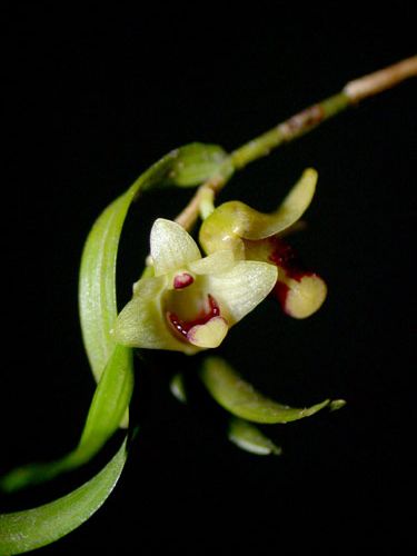 Found in New Guinea at elevations around 75 to 900 meters as a mini-miniature sized, hot to warm growing epiphyte with clustered, slender, flattened stems carrying many leaves that blooms in the spring through fall on a short, single flowered inflorescence arising through the nodes along the stem.