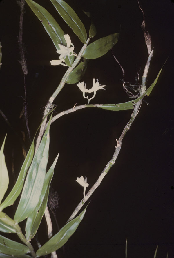 Found only in western Java in primary forests at elevations around 950 meters as a medium sized, warm growing epiphyte with erect in youth and pendant with age, basally very slender stems that gradually enlarge and flatten towards the apex carrying many, thin, lanceolate leaves that are widest towards the base and bloom in the early winter on very short, 2 flowered inflorescnece with the flowers held back to back.