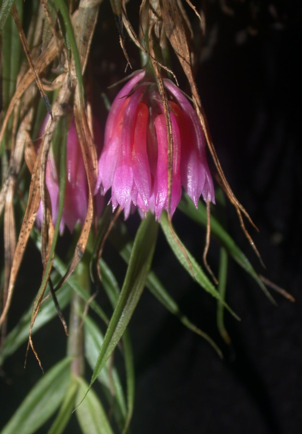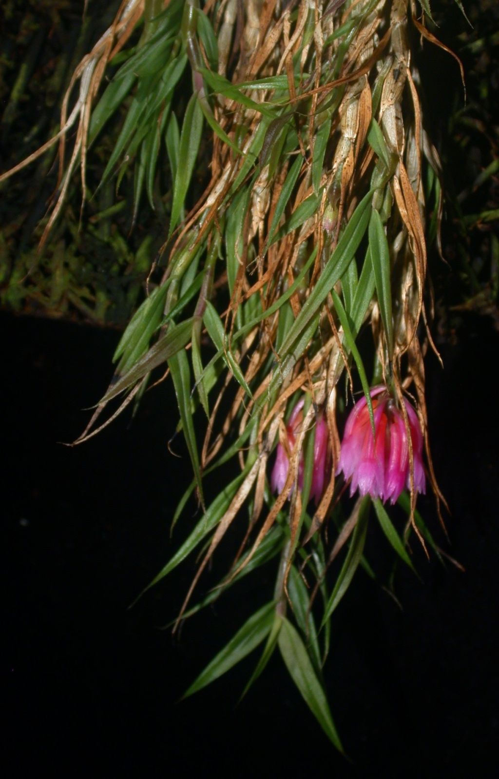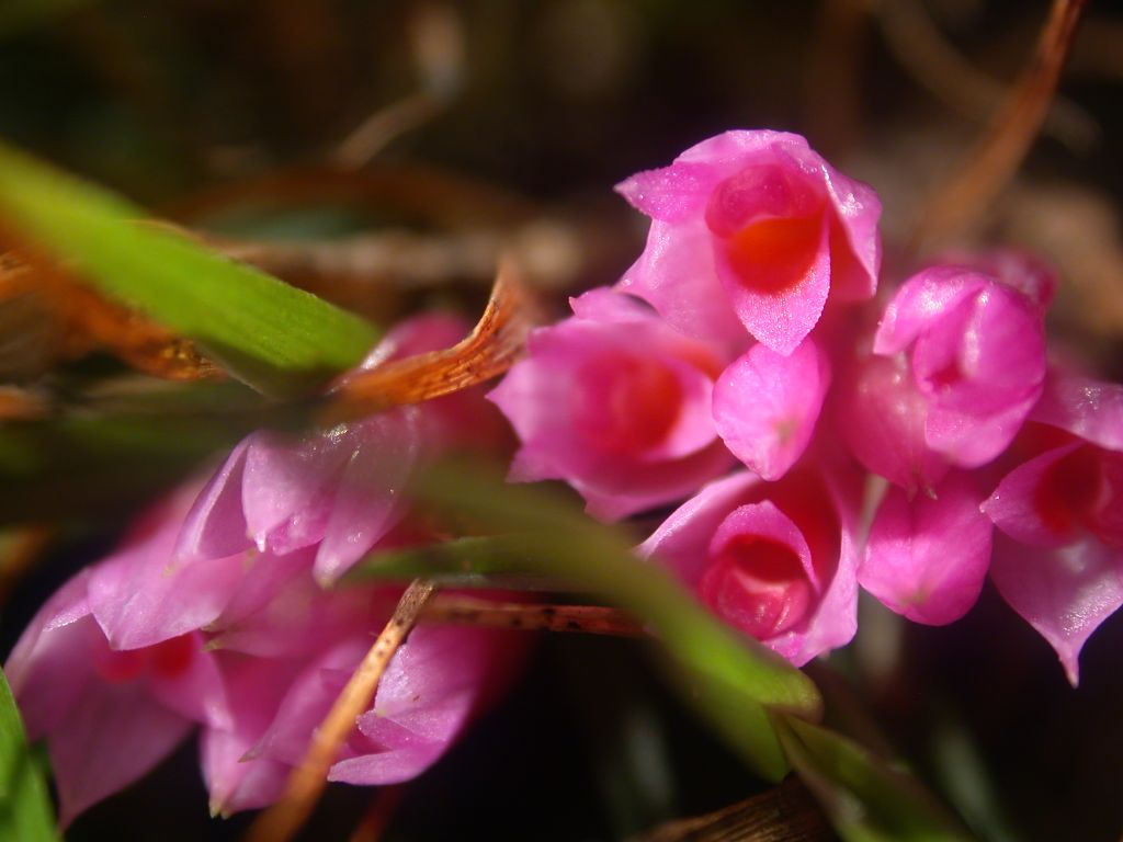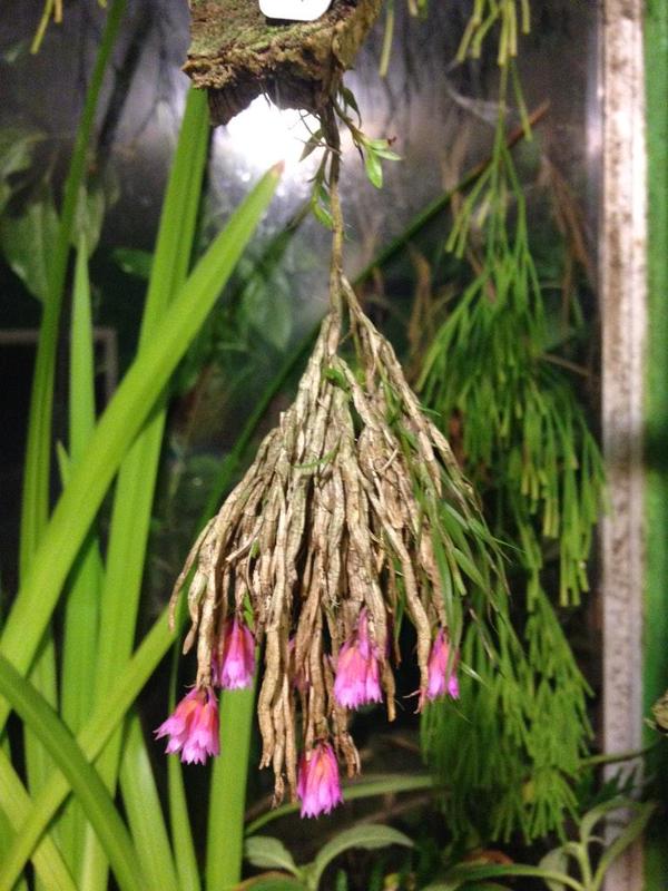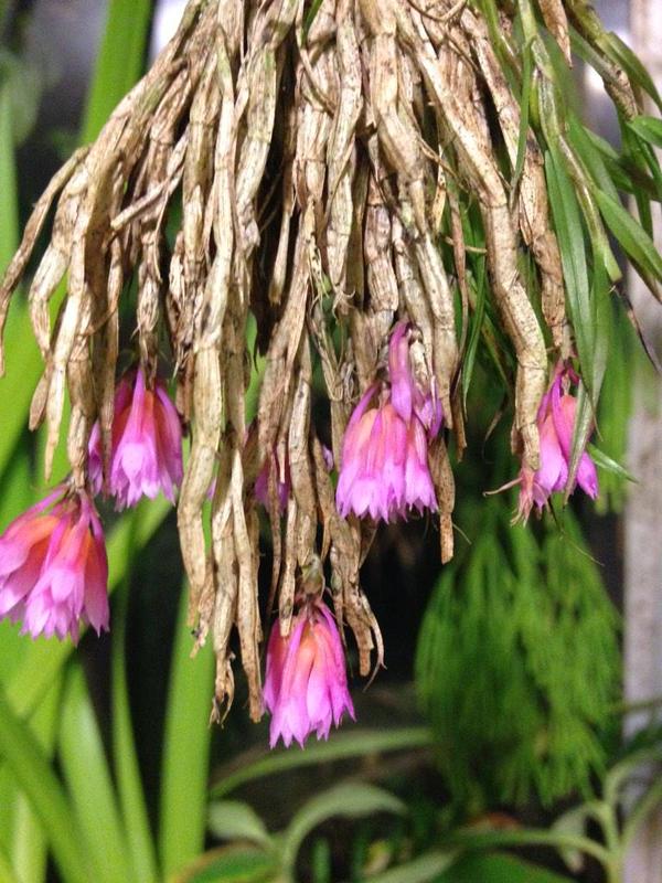 Found in Papua New Guinea and is special in that "there are only three dendrobiums known to have leaves that do not drop off after they die: the familiar and sort of similar Dendrobium dichaeoides; D. protractum; and one that is in a very different section. Since the leaves of this thing don't abscise (you can see the untidy, dead, brown leaves in the photo), it was easy to recognize it as Dendrobium protractum. I shared the photos with André Schuiteman, who was pleased to see it and agrees with the determination". Quote by Lisa Thoerle [Pers Comm]