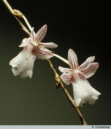 Found in New Guinea in seasonally dry lowlands in exposed locations often along streams at elevations of 100 to 500 meters as a giant sized, hot growing epiphyte with crowded, elongated, laterally compressed, many branched, pendulous, apically with scale leafs only stems carrying many suberect, succulent, strongly laterally compressed, lanceolate, fleshy, sharply acute leaves that blooms in the winter through early fall on a lateral 1 to 3 flowered inflorescence arising in fasciles from the upper part of the leafless the stems and carrying sweetly scented flowers that occur a few days after a rain.