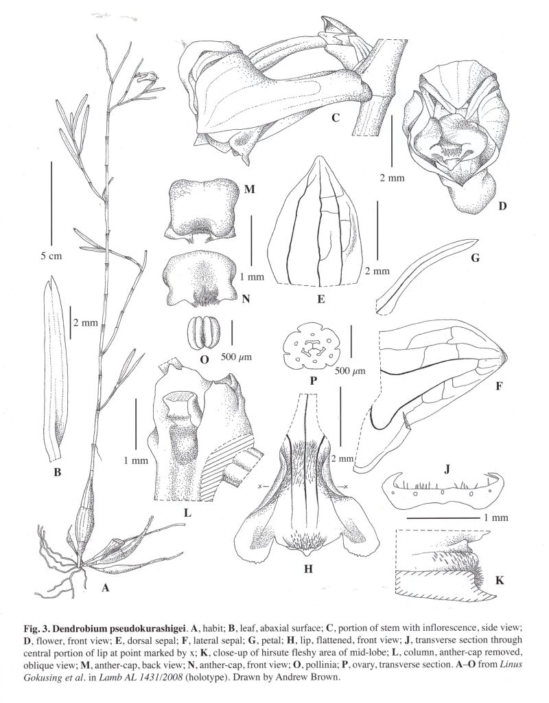 References W3 Tropicos, Kew Monocot list , IPNI ; *Malesian Orchid J. 6: 115 J J Wood 2010 drawing fide; 2008 Dendrobium of Borneo J J Wood 2014 drawing fide;