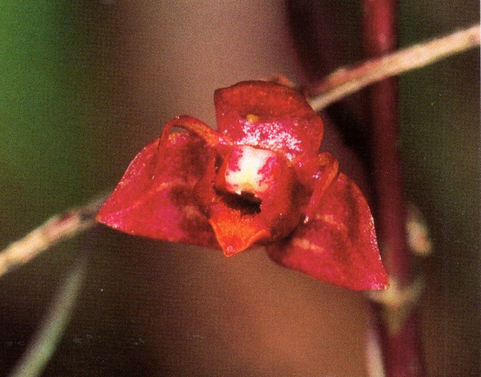 Found in Sabah Borneo in hill forests at elevations around 400 meters as a small sized, hot growing epiphyte with erect to spreading, clustered, branching, very slender, leafy towards the apex stem swelling at the base into fusiform, slightly flattened pseudobulbs carrying linear, acutely bifid, thin textured, green to greenish purple leaves that blooms in the late summer and early fall on sessile, arising from the nodes of the upper portion of the stem, successively single, several flowered inflorescence with glumaceous, grey-brown floral bracts.