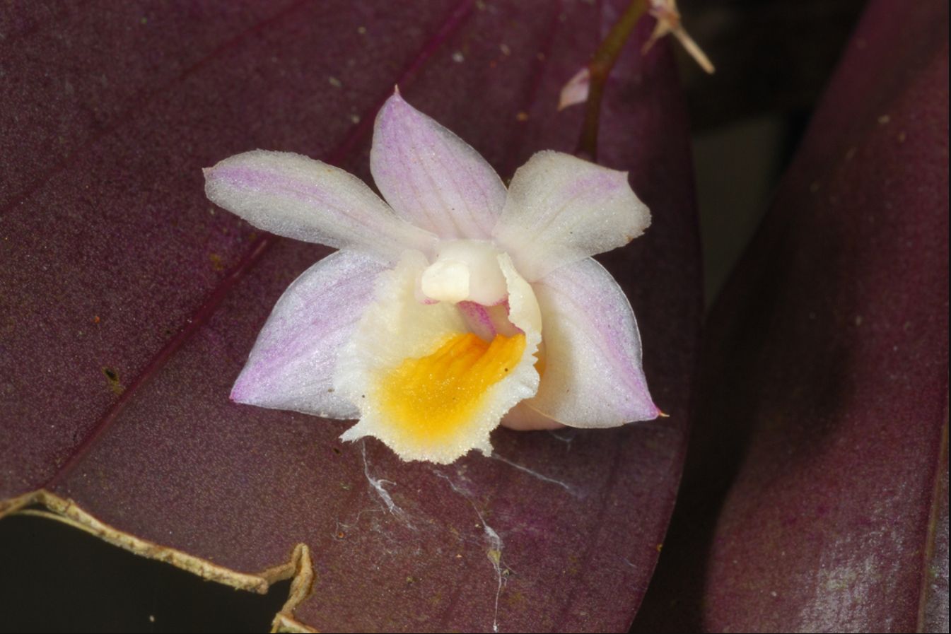 Found in Sabah Borneo in lowland and hill forests at elevations around 700 meters as a mini-miniature sized, hot to warm, erect becoming pendent growing epiphtye with simple, erect becoming pendent, clavate, terete basally, becoming laterally compressed above, acute apically, internoded, dull yellow to purple brown to olive brown stems carrying 2, deciduous [often appearing to be one leafed as the 1st leaf drops early], alternate, from nodes at the narrow edge of the upper stem, narrowly elliptic, slightly obliquely acute to acuminate, thin-textured, dark green above often flushed with purple, dark purple to sometimes green beneath leaves that blooms in the winter through summer on a lateral, appearing subterminal, 1 to 3, at a time, from near the stem apex, .8 to 2" [1 to 5 cm] long, gently fractiflex, purple, 3 to 5 flowered inflorescence with triangular, purple, acute floral bracts.