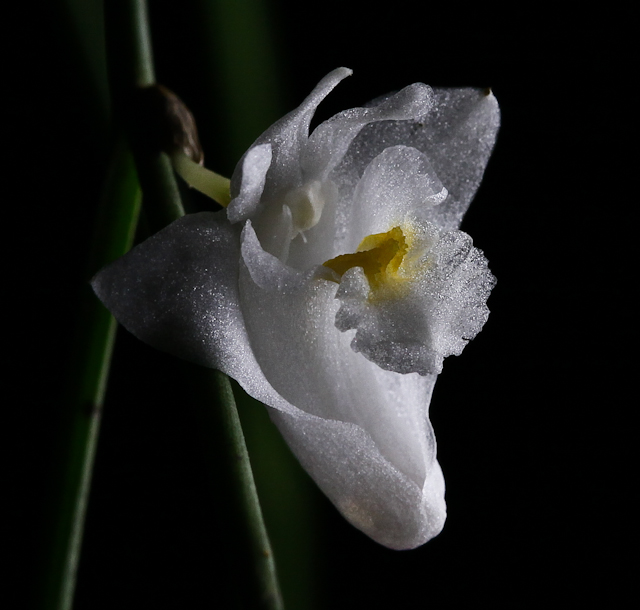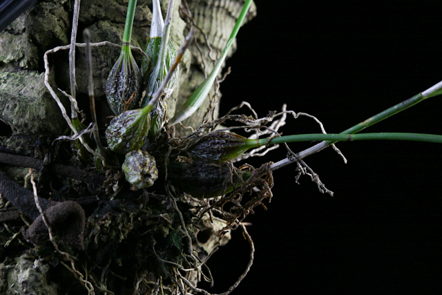 Found in southern Yunnan province of China and Vietnam on tree trunks in montane forests at elevations around 900 meters as a medium sized, warm growing epiphyte with erect, rigid, slender, glossy, unbranched, many noded, basal 2 internodes swollen to form a fusiform pseudobulb carrying 4 to 6, sparsely distichous, ascending, subterete, slender, fleshy, acute apically, contracted below into the clasping sheath base leaves that blooms in the later summer on a short, single flowered inflorescence arising from the nodes near the apex of the stem with 4 to 5 basal sheaths and ovate, acute floral bracts.