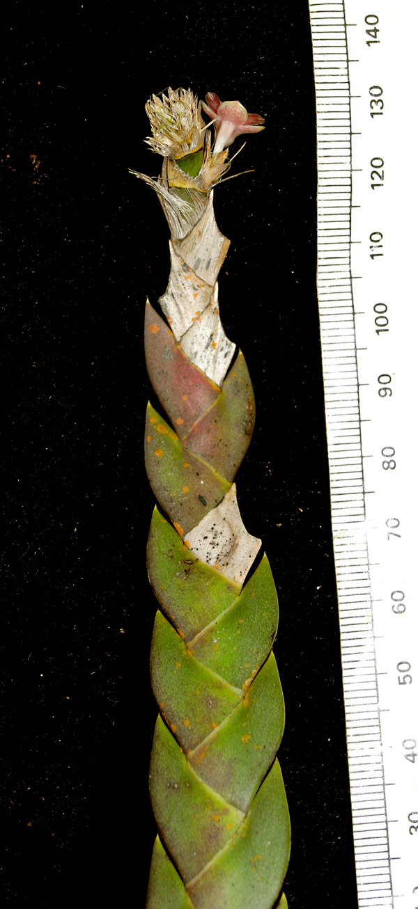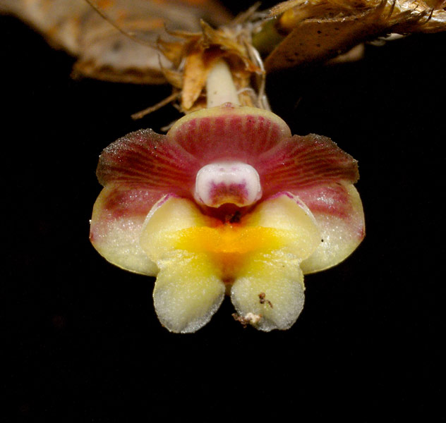 Found in penninsular Malaysia and Borneo on trunks and branches of trees along rivers at elevations around 100 to 700 meters as a small sized, hot to warm growing epiphyte with erect, leafy stems, enveloped completely by imbricate, leafbearing sheaths and carrying oblong-triangular, purple suffused, acute, conduplicate leaves that blooms in the fall and winter on short, axillary, successively single flowered inflorescence arising from nodes towards the apex of the stem.