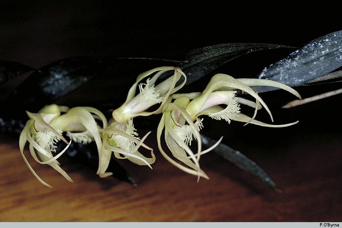 Found in New Guinea in lowland forests at elevations of sealevel to 350 meters as a large sized, hot growing epiphyte with crowded, elongated, slender, elliptic in crossection stems with tubular leaf sheaths and carrying many erect, small, lanceolate, basally half twisted, unequally acutely bidentate apically leaves that blooms in the spring and fall on a lateral from the stem, very short, 2 flowered inflorescence arising through a laterally compressed spathe and carrying thin textured flowers.