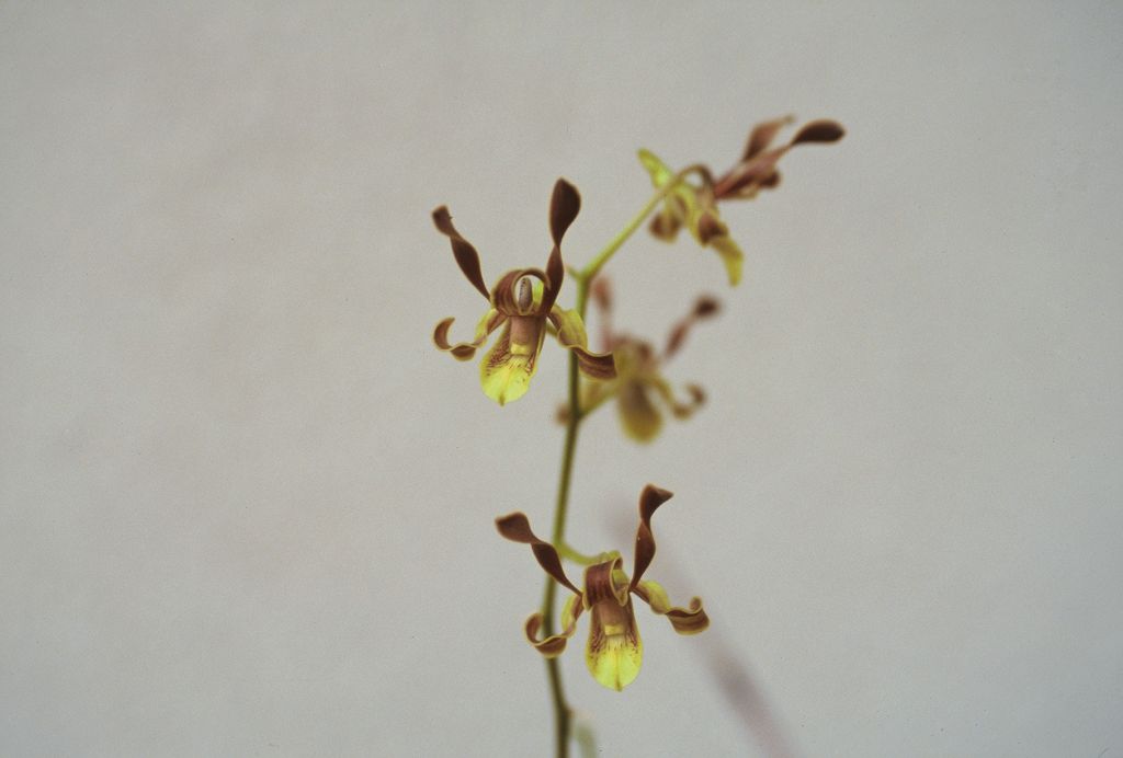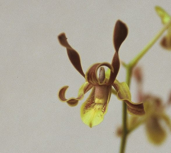 Found in western New Guinea in clear forests at elevations around 250 meters as a medium sized, hot growing epiphyte that blooms on a 7.2 to 10" [18-25] cm long, 4-8 flowered inflorescence