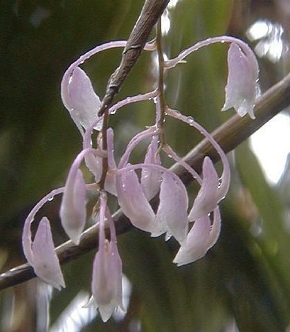 Found in northern Papua and New Guinea as well as Vanuatu in moss-covered mist forests at elevations of 1200 to 1300 meters and in primary and secondary forests at elevations of 40 to 800 meters as a medium sized, hot to cool growing epiphyte with clustered, dull purple, erect, grooved, basally swollen stems carrying many, thin-textured, linear, pointed, erect, unequally bilobed apically, bright green, purple flushed leaves that blooms in the spring on a olive to purple green becoming red, pendent, clustered, 8 to 15 flowered inflorescence that arise from the nodes on the upper half of leafless stems carrying smaller flowers.